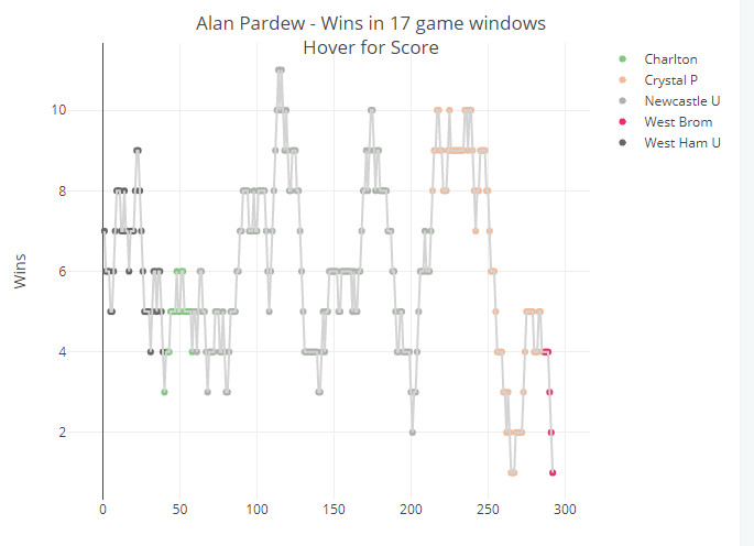 Well stage one hasn’t happened with WBA as they have yet to win a game in six but how true is it of his four other Premier managerships. Zoom into bottom left hand corner to view first six games