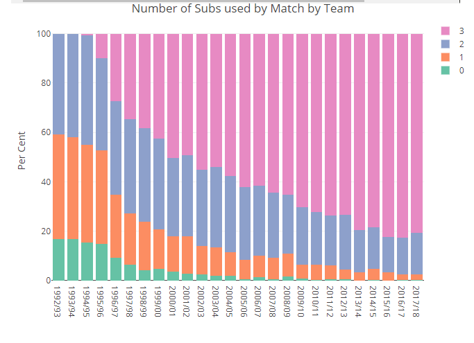 In 2015/16 there were also no occurrences though it picked up a bit last year - when three substitutes were used a record 82.6% of the time