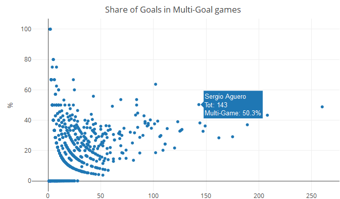 At the time of writing, multi-goal games now account for over 50% of his goals - only exceeded by Kane and Henry of those players that have scored at least 100 Hover any point for furter information