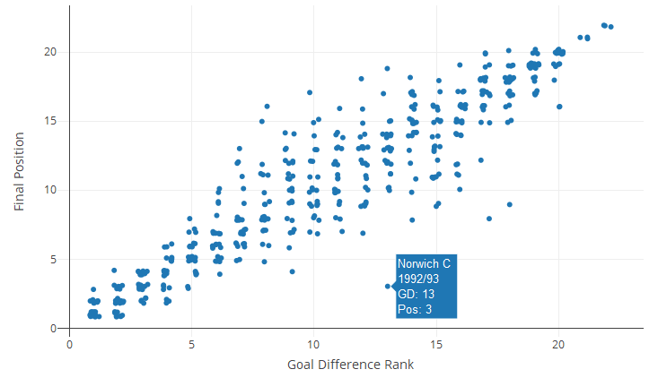 N.B. The points have been jittered to avoid overlapA couple of outliers include Norwich in the inaugural PL season; they finished 3rd but with a negative goal difference of -4. On the other side of the coin, Birmingham were relegated in 19th place but were only 13th in goal difference